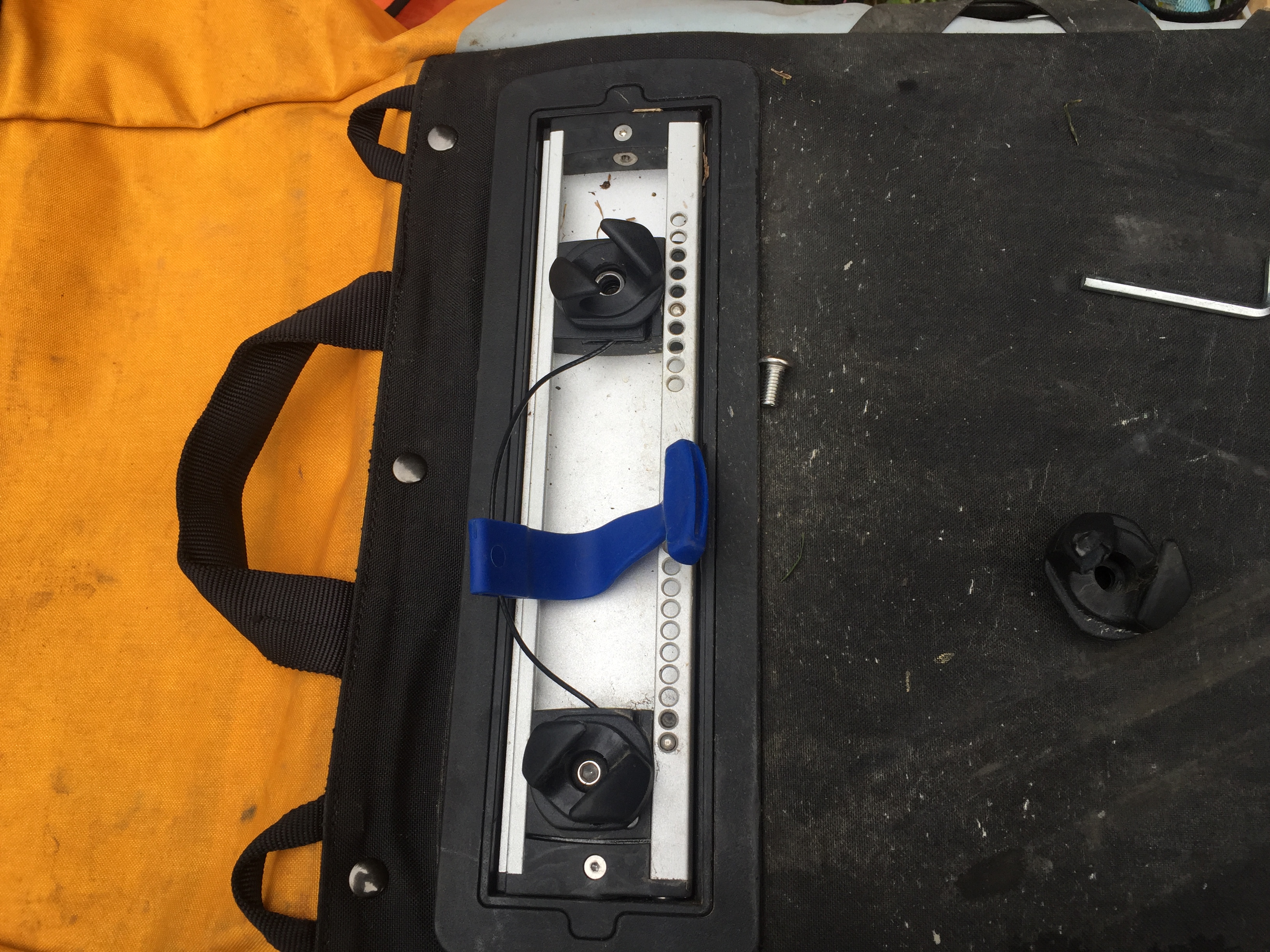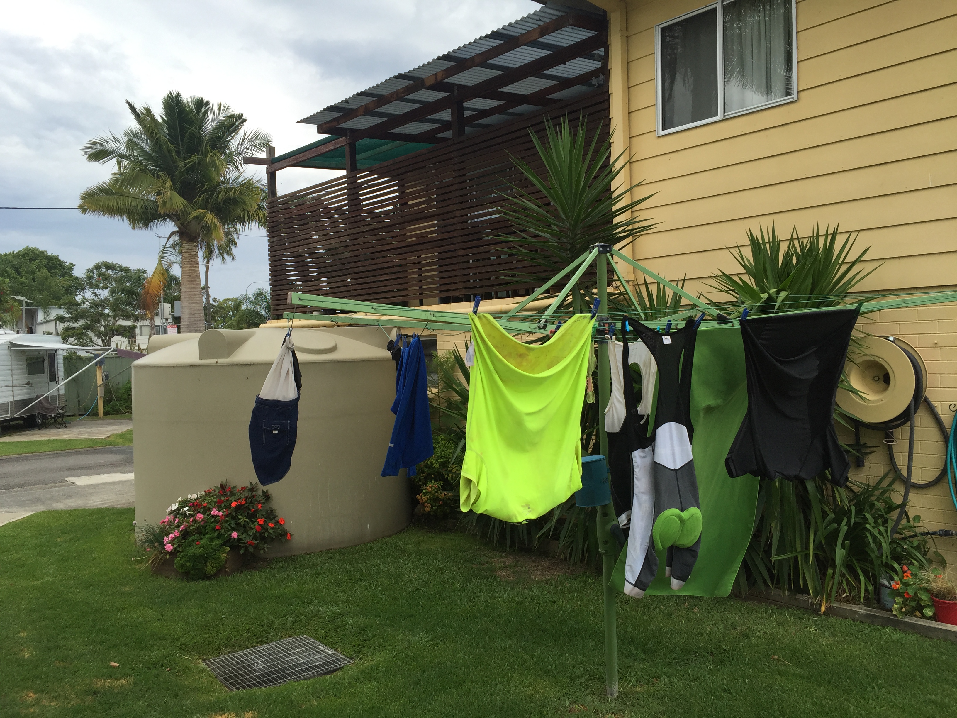 Ved ankomst til caravan parken henger de opp vått tøy og teltet får tørke. En god og varm dusj, tørre klær og Lasse tar seg en power-nap i teltet. Anders pusler med sitt, fyller dekkene sine med luft, justerer bakskjermen og vasker sykkelen med hageslangen. I tillegg måtte han bytte det ene festet på sykkelvesken. Mot slutten av dagens etappe kom Anders for nærme en sånn hvit vei-pinne med refleks på, den var såpass hard og godt montert ned i asfalten at den reiv av venstre sykkelveske. Anders fikk hengt på vesken på et midlertidig vis og den hang på helt frem. Heldigvis hadde de med et ekstra feste som enkelt kunne erstattes ved hjelp av en umbrako-nøkkel. Her er utstyret i orden.