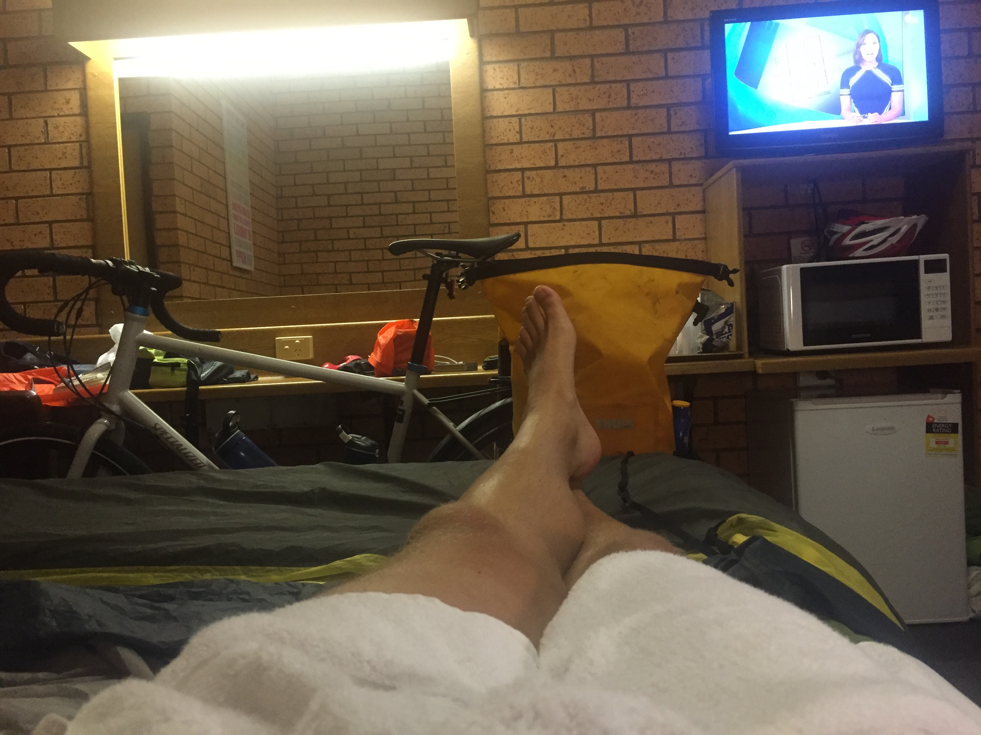 The headwind was very strong today. They have not had headwind like this since the two first weeks in South Australia on the huge never ending roads. On a flat distance like today it is the wind that tests the boys. Are they gonna reach the target they set out for the day or are they gonna adjust and settle for a shorter distance? After lunch in Nambucca Heads it is 50 km left and the clock is 3:00 pm. Anders says “yes, it’s only to keep going”when they cycle from McDonalds. At this time Lasse doesn’t know that Anders spent the lunch booking a motel in Coffs Harbour as a reward for 6 days with 100 km per day on average, wet clothes, wounds in the rear end sour muscles. To get all the clothes dry is essential. The wet days have made their butt sour and wounded. Hey we all got our problems, don’t we?