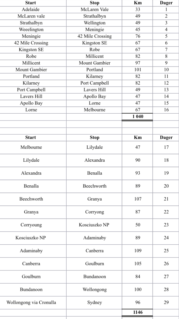 The photo beneath shows the different stages from Adelaide to Sydney, which is almost they way the route turned out.