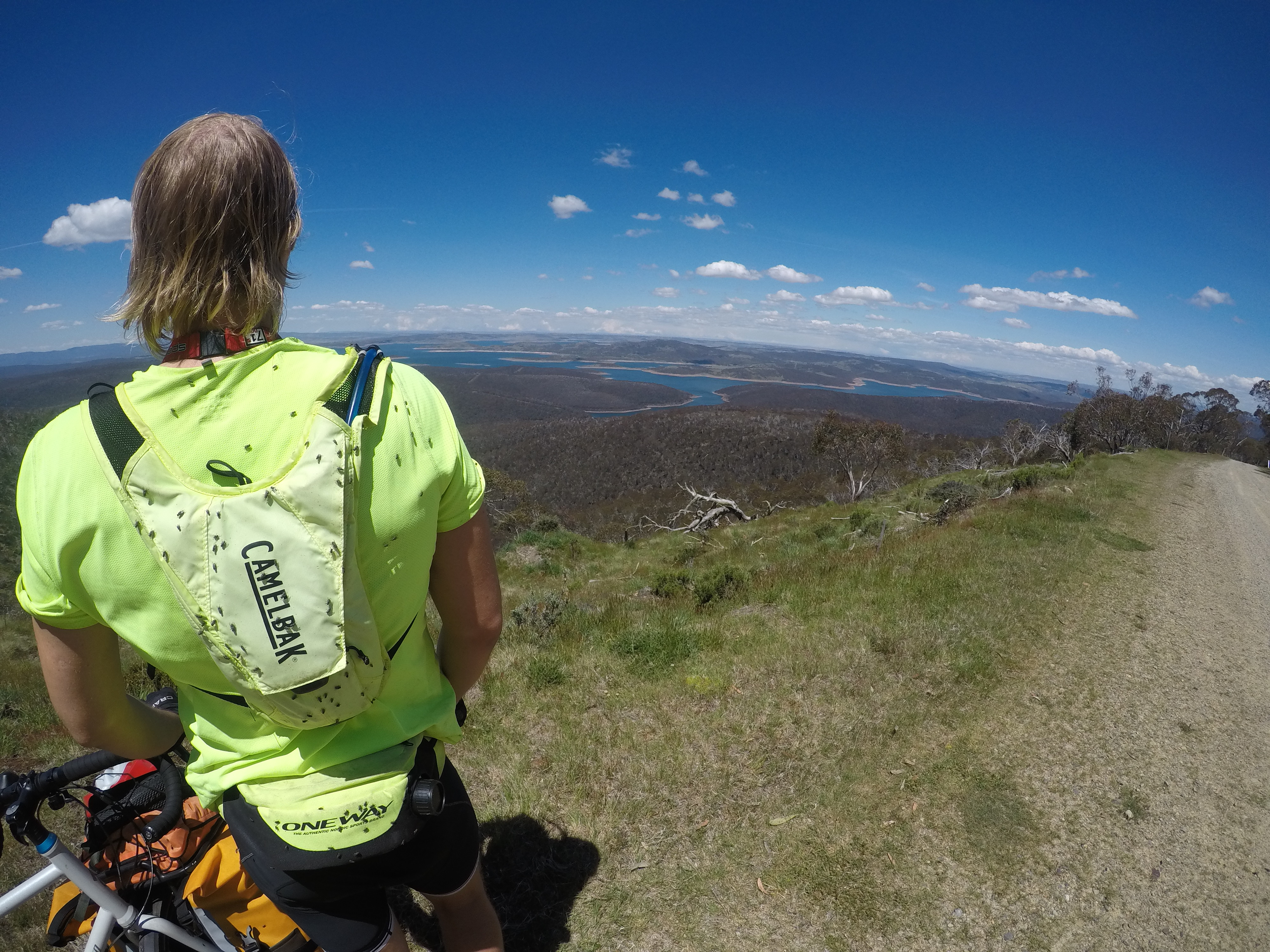 Anders starts walking and pushing his bike early and the steepness and how far and hard this will be already scares him. They are gonna do 60 k’s into the mountain, close to Australia’s highest “city” Cabramurra. They are at 350 meters above sea level and are going up to 1600. It is hot and the bikes is heavier than normally since it is loaded with more water and food.
