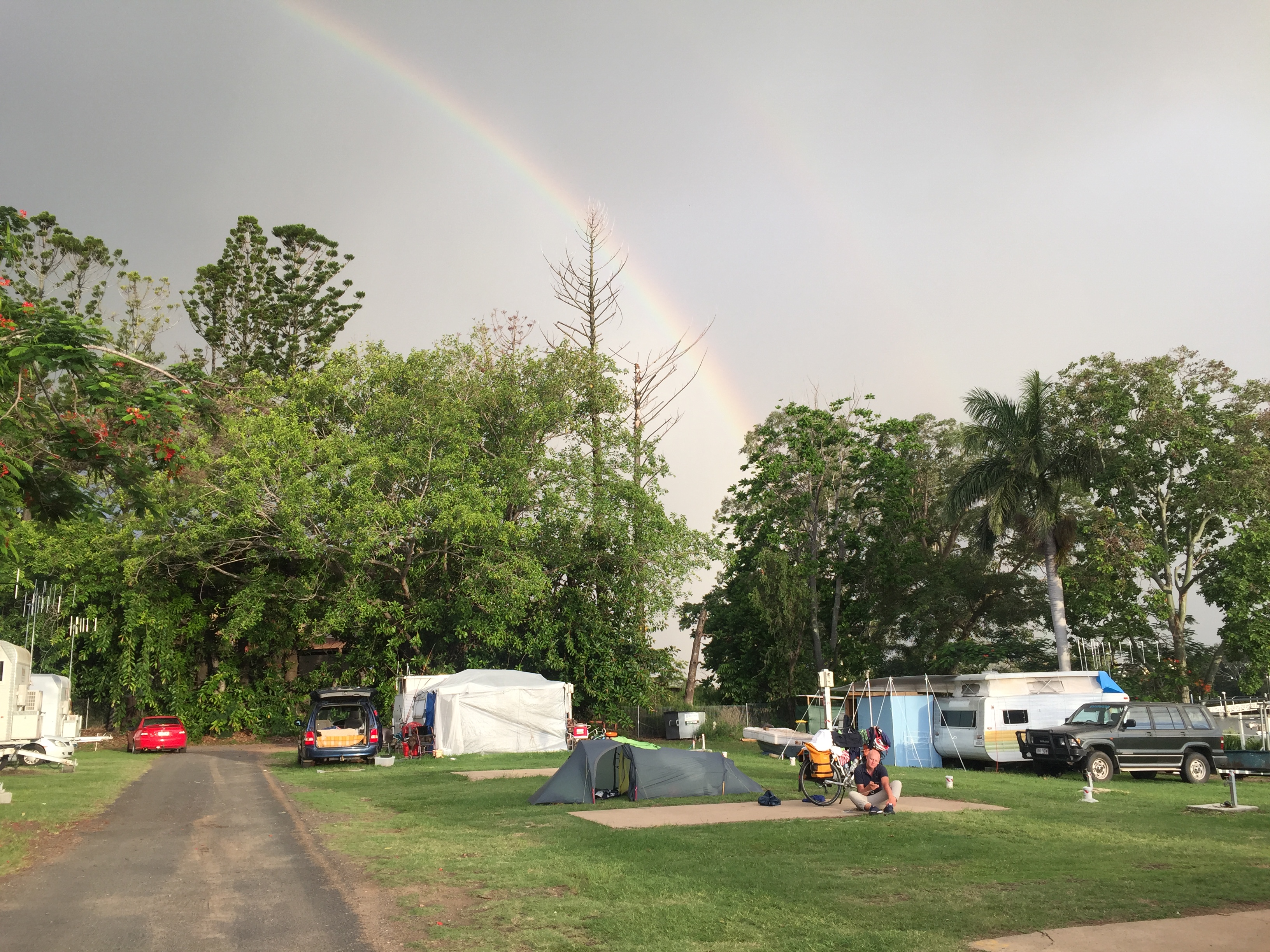 A rainbow warns about more rain and they are trapped in the tent. Right now they should have umbrellas and not bicycles, as they would like to go to a restaurant or grocery store. It’s Saturday but the night fever isn’t quite there.