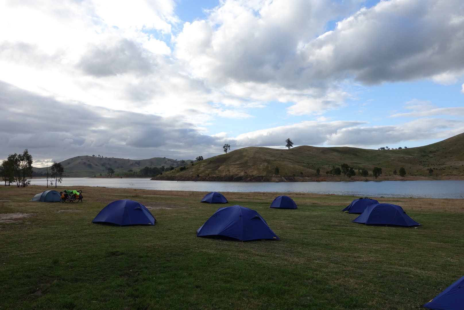 The beginning of todays leg was like a dream, even though it rained and was a bit cold it, it went slowly downhill and the first 44 k’s were done in 2 hours. They had a short stop in Alexandra where they ate 2 burgers. It continued mostly downhill with the exception of a few steep hills so the leg wouldn’t be to comfortable. The only facilities Anders and Lasse had access to last night was a couple of public toilets, so they didn’t even bother to take of the tricot. They put the wool long John’s outside the sweat tricot. The two primarily reasons for this were that they were afraid of freezing and afraid of snakes. Therefore as little organizing as possible outside the tent.