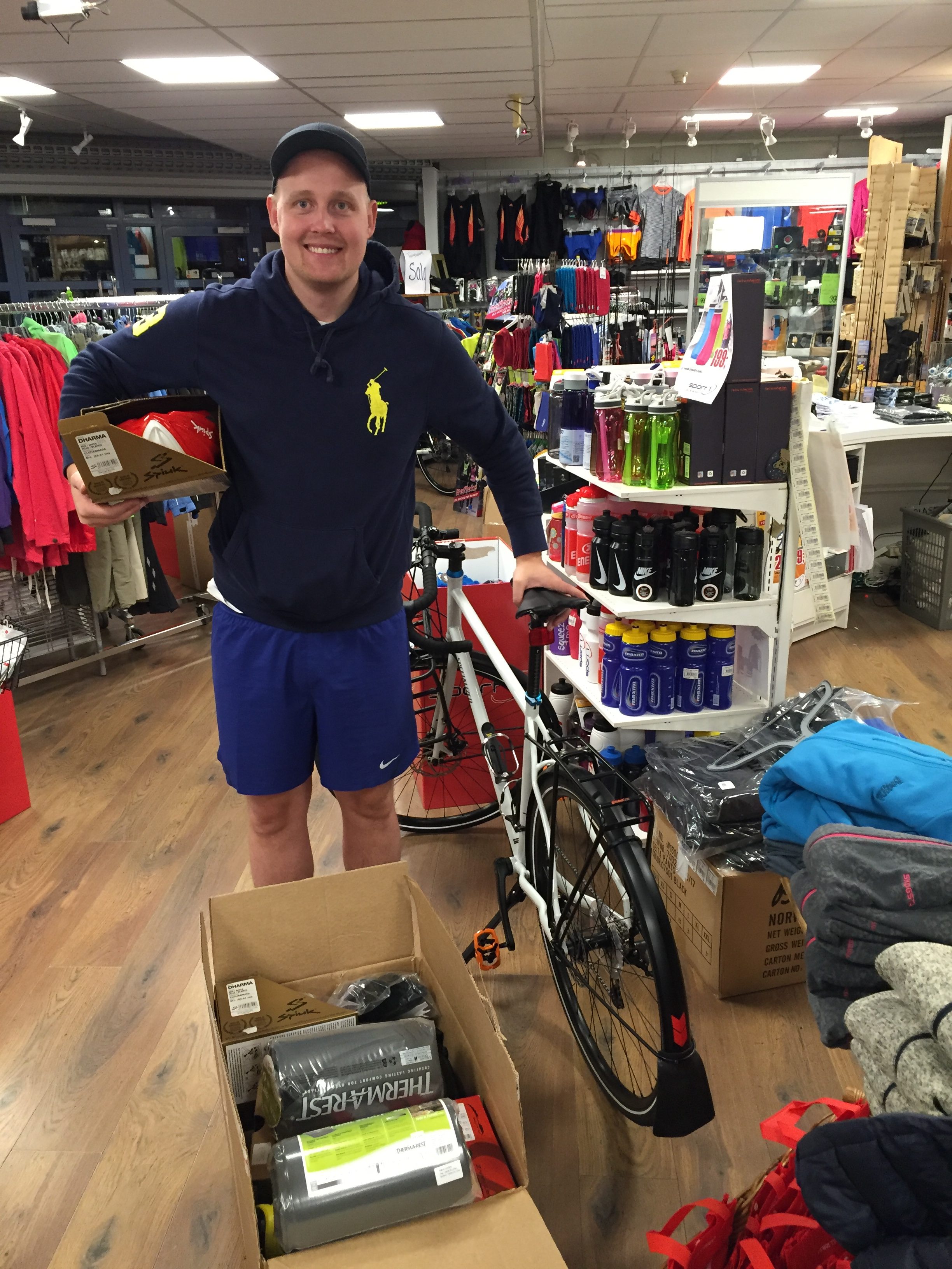A load of equipment later that had most of what they needed. Bicycle pump, glasses, johns, shirts, tricot, gloves, helmets, shoes, locks etc etc etc. a good offer was made for the guys and they smiled from ear to ear. Now it really started.
