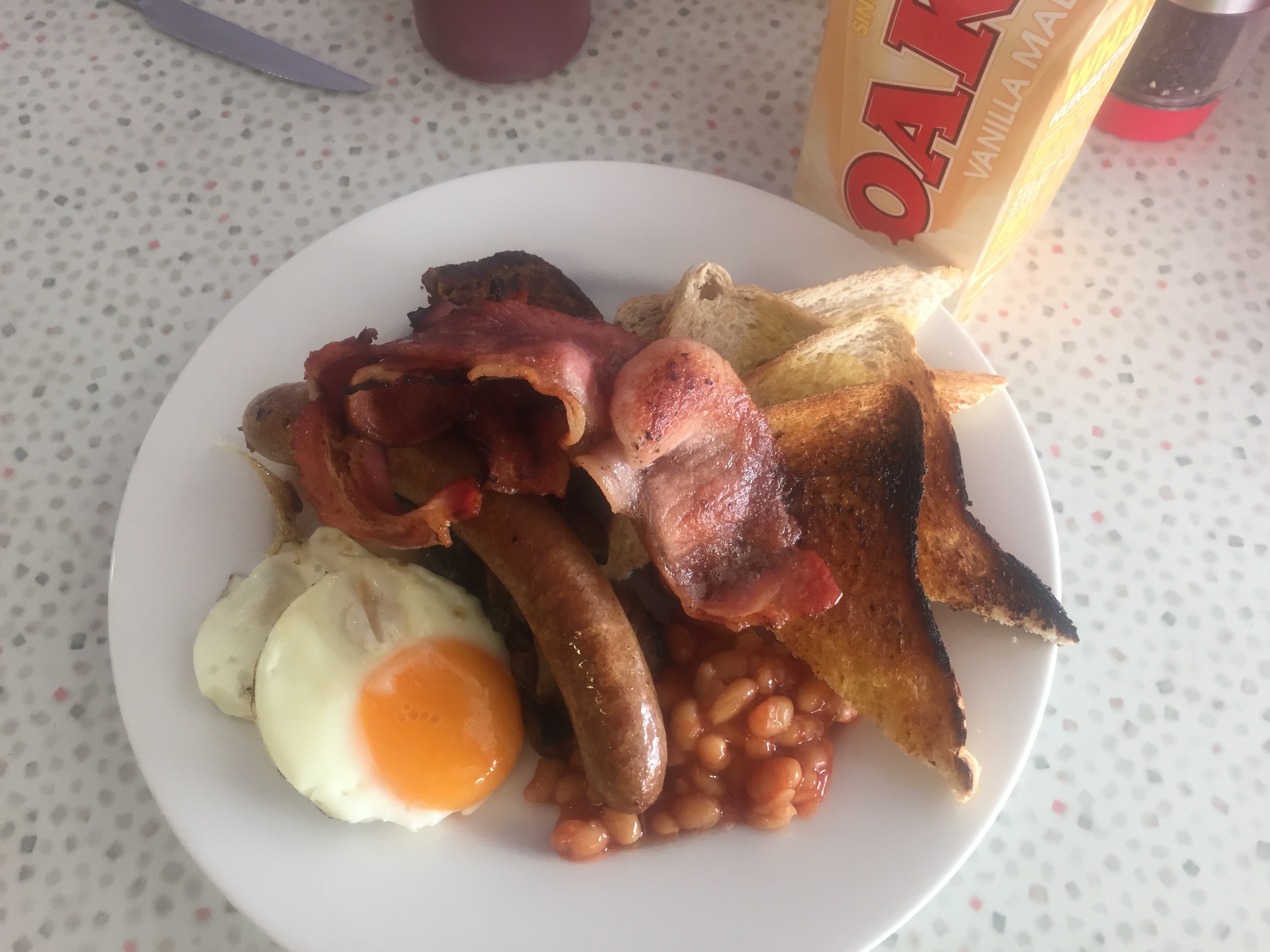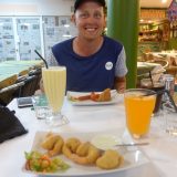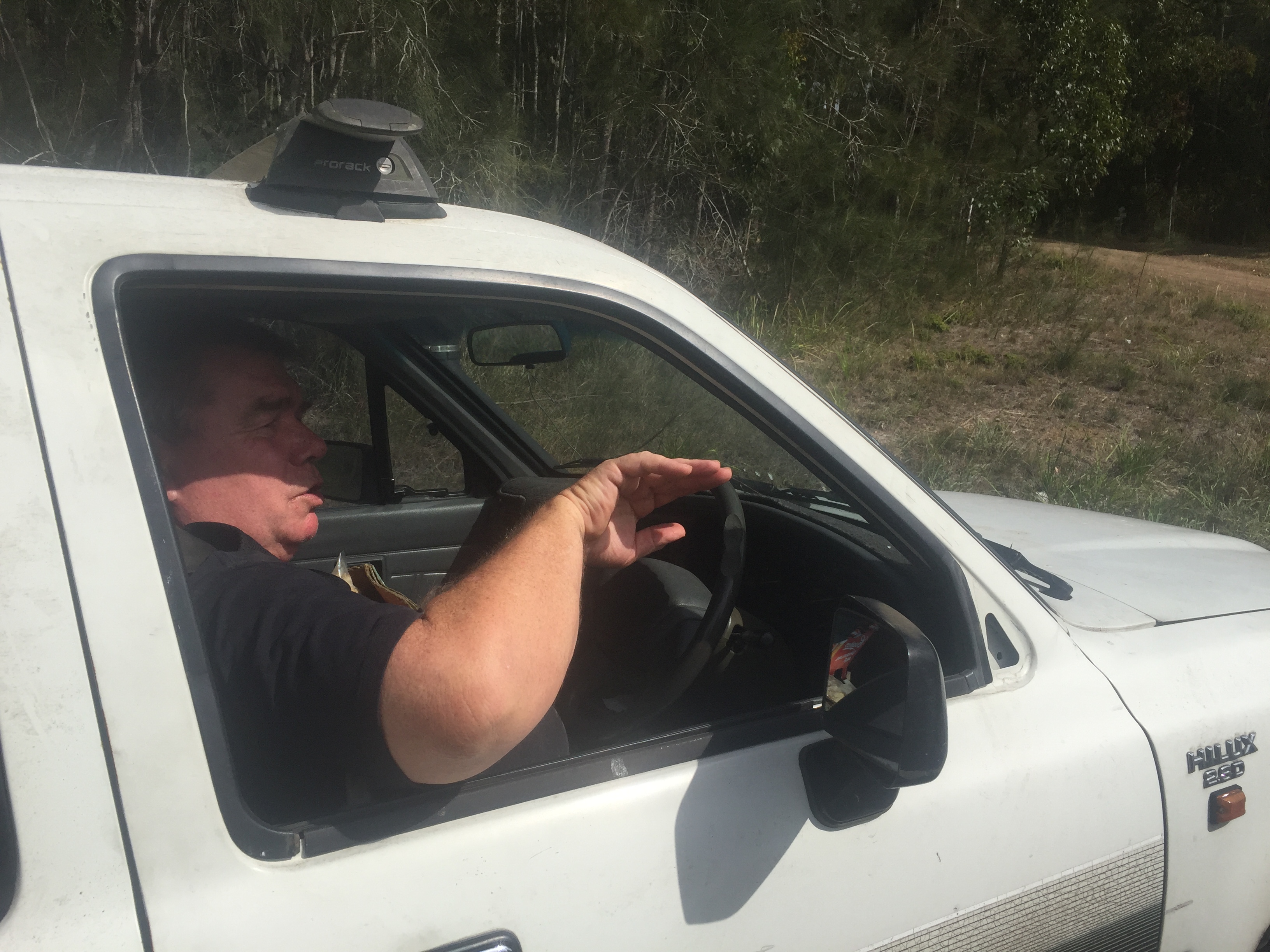 After 40 km that include a ferry trip of 45 seconds and 15 km on a dirt road, they arrive in Bulahdelah. Lunch at an old cafe. Bacon, egg, sausages, beans and toast. The man in the register is a bit weird but curious about the tall blond guys. He shows them a map before they leave and let them fill up water on their bottles.