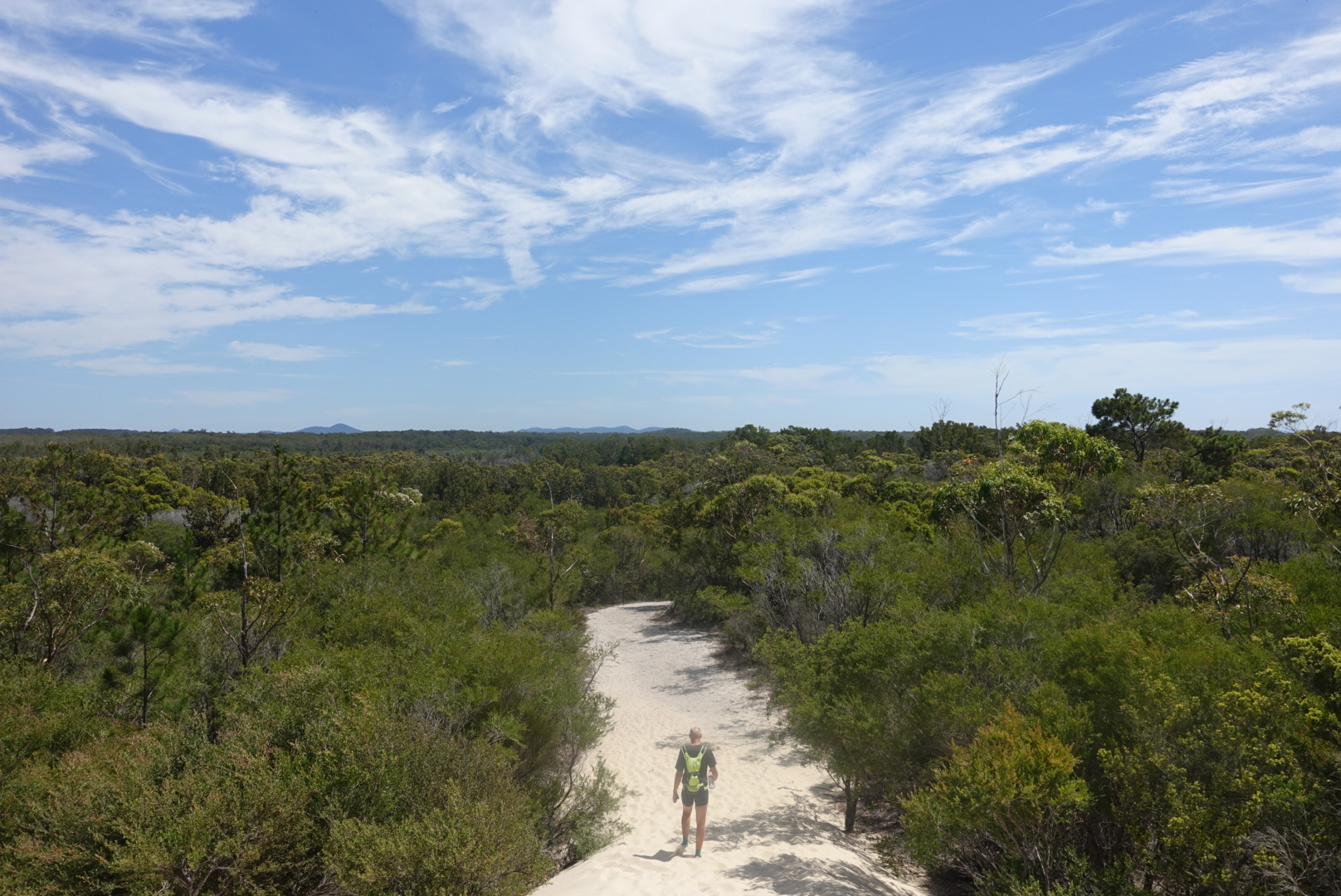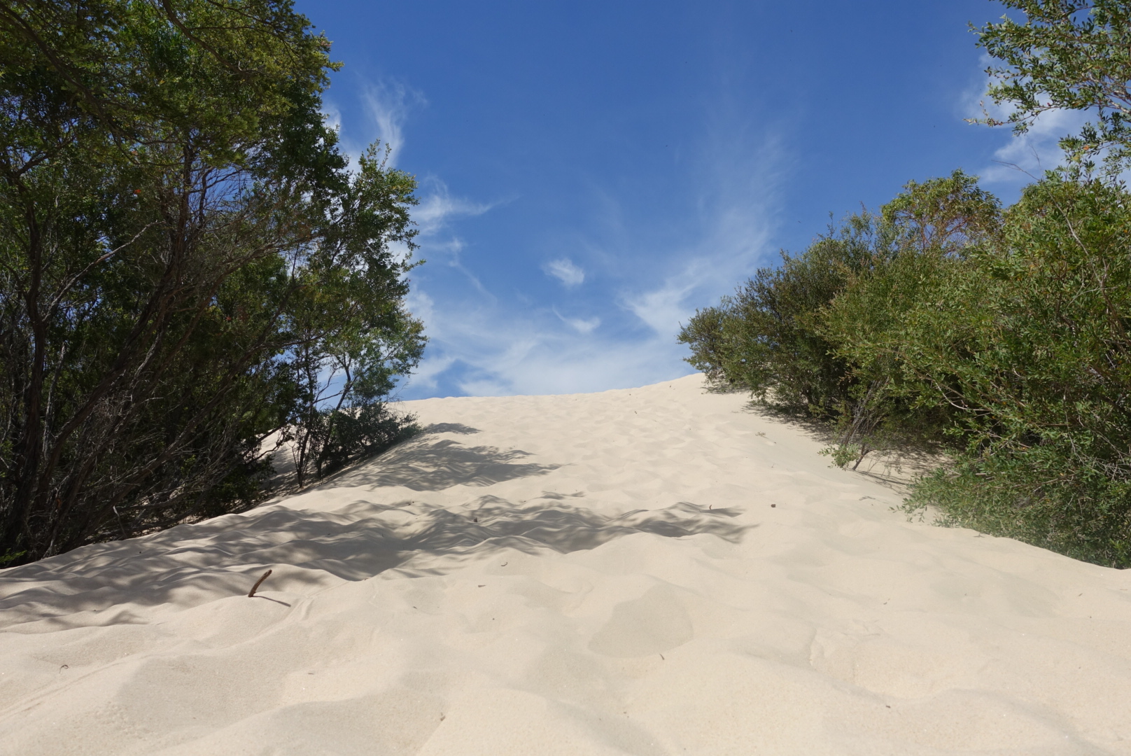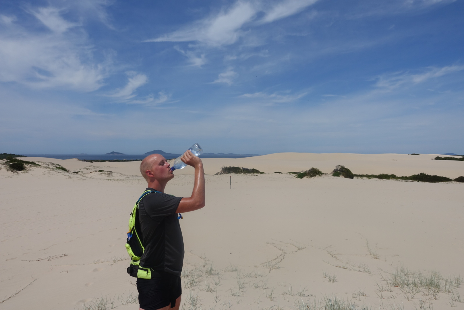 They leave the boat and cycle over a bridge and into a national park. It’s extremely hot for the third day in a row and their water turns into the temperature you drink your tea at. After a bit more than 10 km they stop to have a look at a beach. Huge sandbanks leads towards the ocean. They walk 100 meters and enjoys the view, it is like a small desert as a beach.