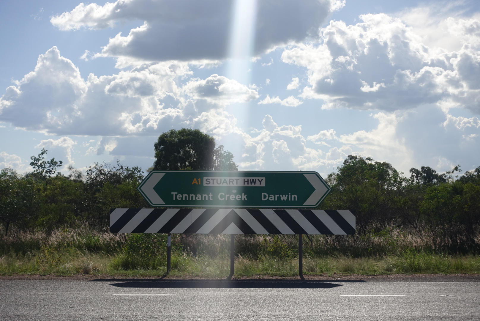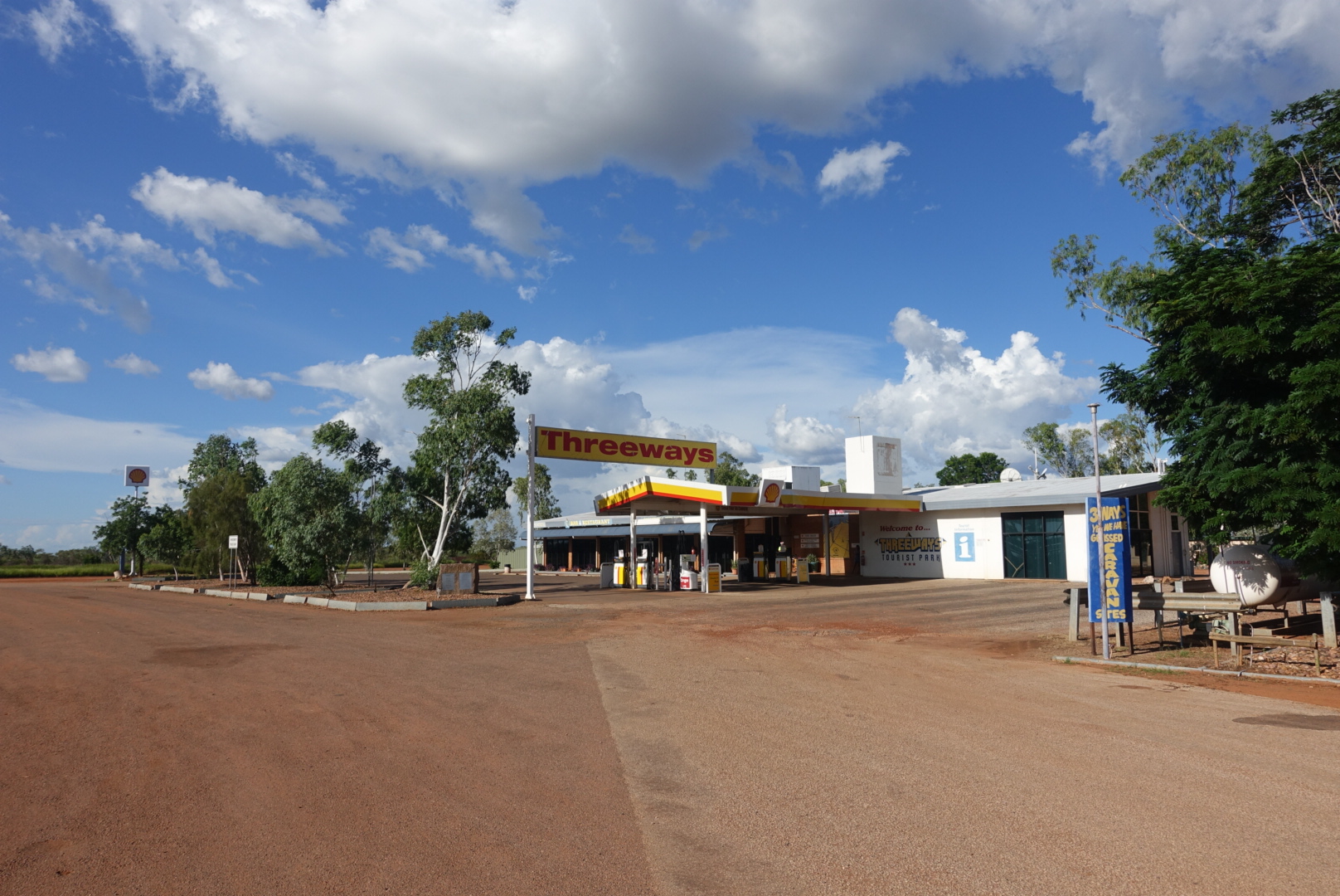 inn til krysset som de lenge har hatt i hodet, Threeways Warumungu. Venstre er sørover og i retning Alice Springs og Uluru. Høyre er nordover og i retning Darwin. De booker et lite rom med to enkeltsenger og aircondition, spiser Thai Green Curry og drikker brus. Ny dag og nye muligheter på sykkelen i morgen.