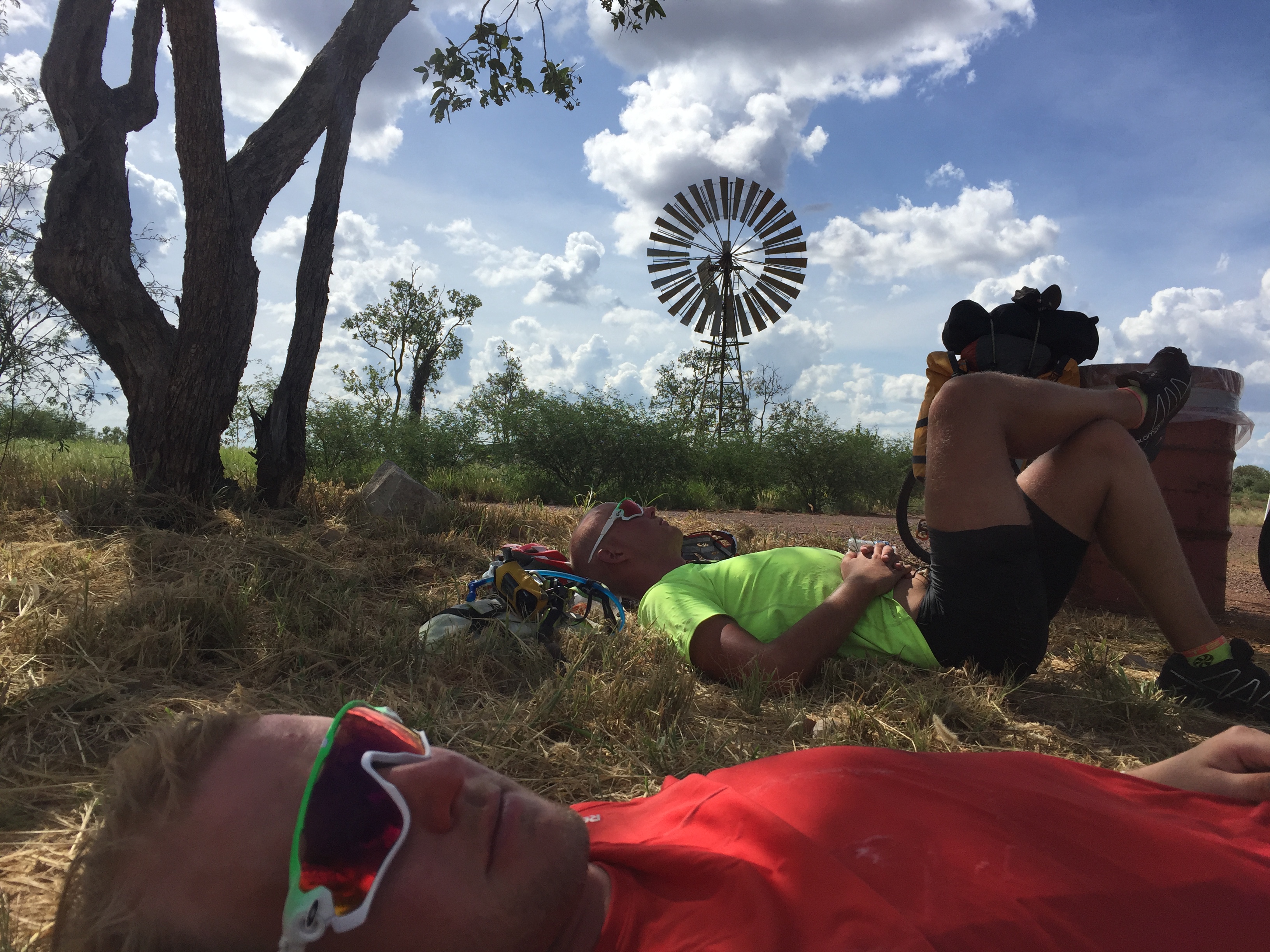 Etter enda 50 kilometer legger de seg rett ned på bakken. Sover litt, drikker litt og nyter skyggen som det store treet bak dem gir. Maurene er overalt, men de driter i det. Anders spør om de skal slå leir i veikanten, eller om de skal kjøre på 40 kilometer til og bli ferdig med det. Lasse bestemmer. Lasse tenker på det og bestemmer seg for å kjøre på. De har fått seg en god hvil og temperaturen er ikke skyhøy i dag. 40 kilometer til etter 150 skal kunne gå.