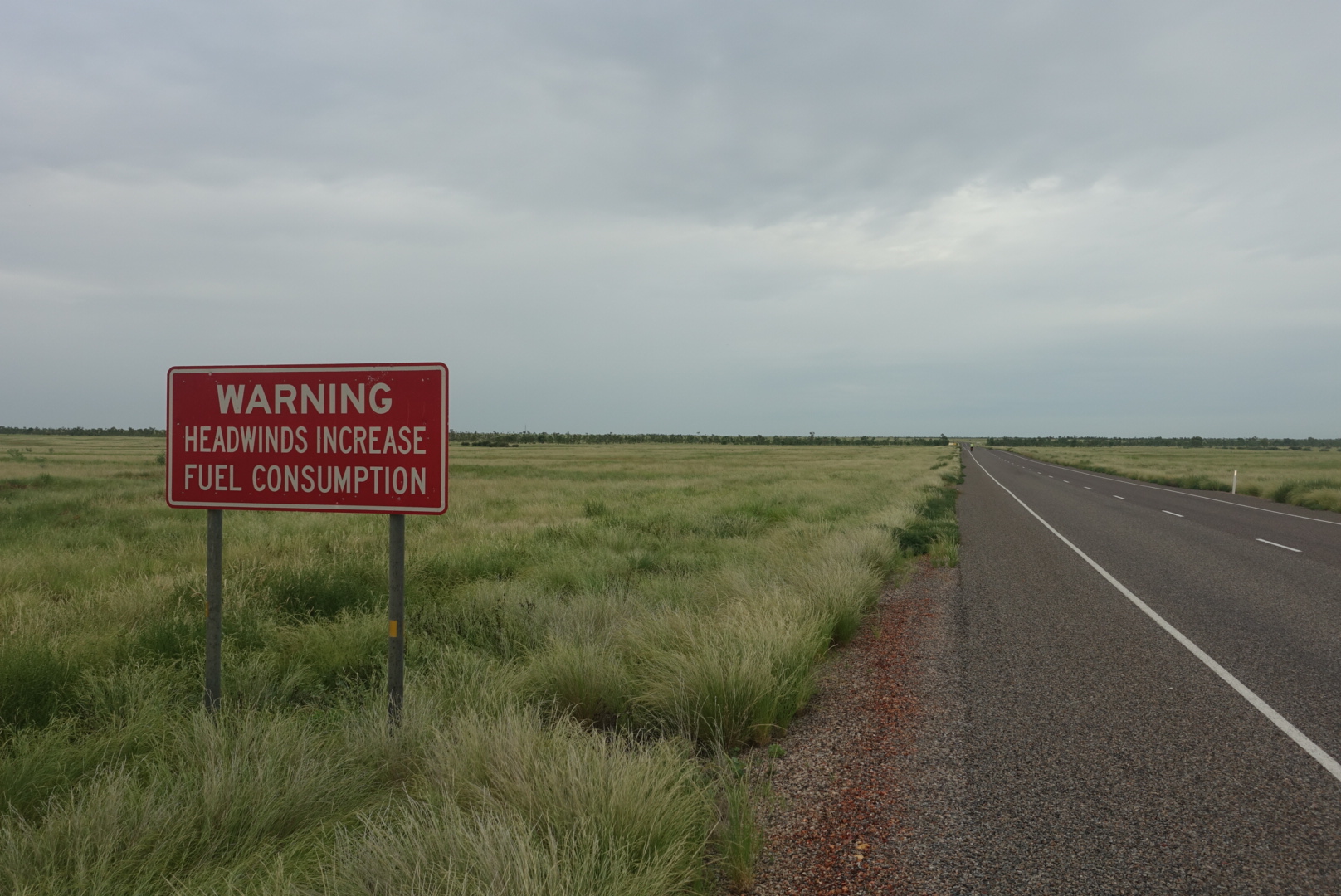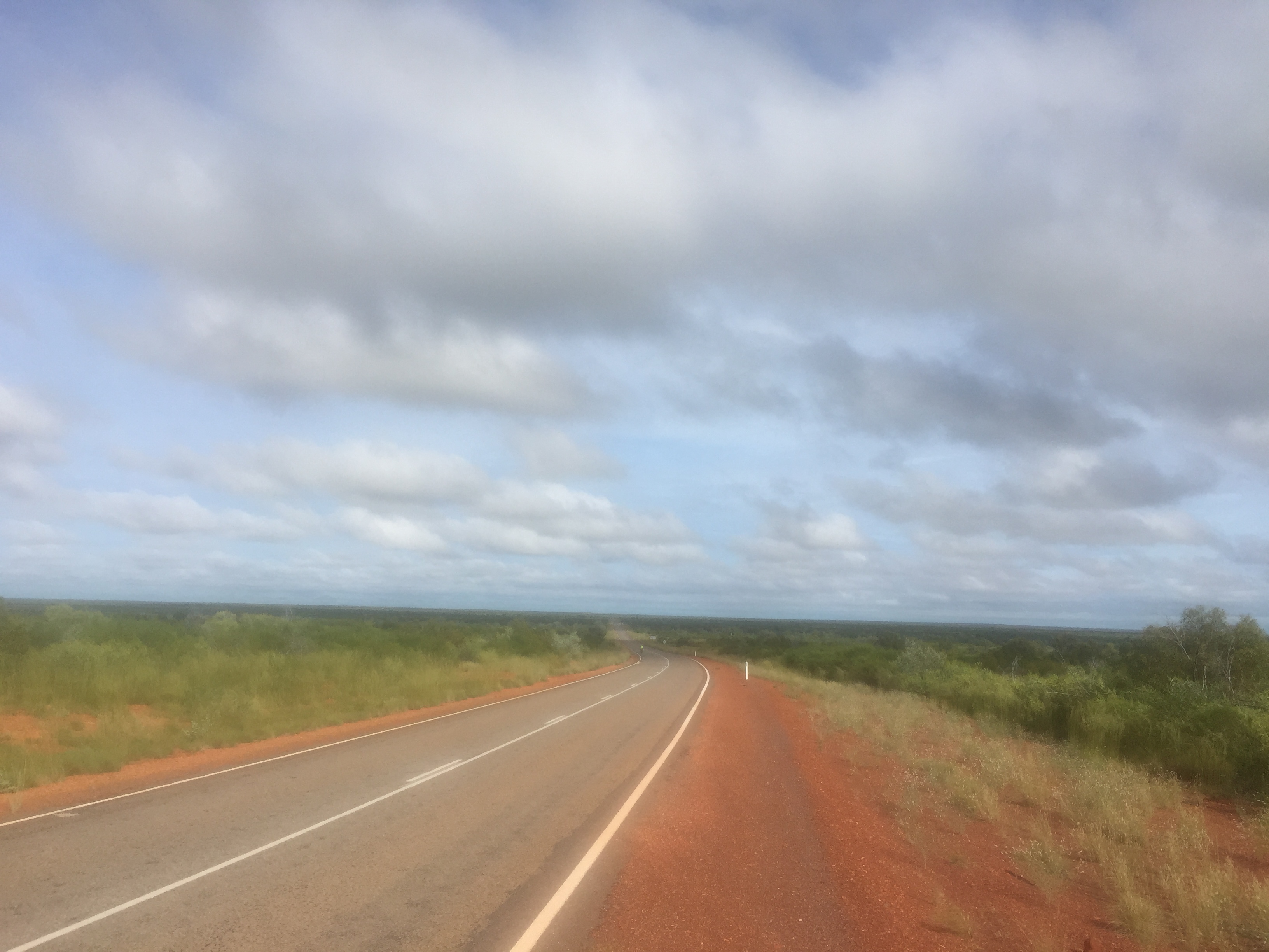 Mandagen fortsetter i et behagelig tempo godt hjulpet av medvind. Få kalorier forsvinner. Landskapet var endeløs beitemark i alle kompassets retninger. Det grønne gresset strakk seg helt til horisonten og enda litt lenger så det ut som. Veien ble akkurat på grensen mellom Queensland og Northern Territory smalere i fortsettelsen. Anders tenkte at skulle veien fortsette å være så smal kunne dette bli interessant. Heldigvis bedret veien seg utover dagen og det var ingen fare. Trafikken de siste dagene har vært minimal og det er nesten utrolig å tenke på at dette er hovedveien mellom midten av nord og østkysten av Australia. Uten overdrivelser kan guttene si at de kanskje har sett kun 20-25 biler, totalt i begge retninger, road trains inkludert på en hel etappe.